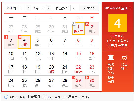 根據(jù)國(guó)務(wù)院2017年清明節(jié)放假規(guī)定及結(jié)合我司情況具體安排:4月1日正常上班,4月2日、3日、4日放假,共3天。