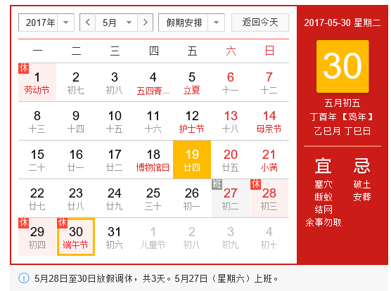 5月30日(星期二,農(nóng)歷端午節(jié)當(dāng)日)為國(guó)家法定節(jié)假日