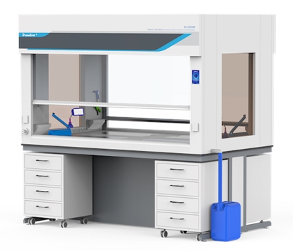 君勒鉑?(DreamLab?)DL-FHDU系列桌上型下排風(fēng)雙面無管凈氣型通風(fēng)柜,專為配合中央實(shí)驗(yàn)臺上進(jìn)行的實(shí)驗(yàn)而研制,通過內(nèi)置的過濾系統(tǒng)而不是復(fù)雜昂貴的通風(fēng)管道和廢氣處理系統(tǒng)為操作人員提供化學(xué)氣體或粉塵防護(hù)。操作人員可方便地使用整個桌面的任何區(qū)域。采用先進(jìn)觸控技術(shù)的DLTouch自動安全控制器,提供了極易操控的系統(tǒng)界面,確保通風(fēng)柜一直在安全可靠的狀態(tài)下運(yùn)行。該通風(fēng)柜帶有附加臺面下雙層箱式集氣通道,集氣箱上層布置有可移動下向集氣口,工作區(qū)產(chǎn)生的廢氣和粉塵通過側(cè)面排風(fēng)格柵和臺面內(nèi)集氣口送往頂部的過濾系統(tǒng)處理。桌上型下排風(fēng)雙面無管通風(fēng)柜的長寬高各個尺寸都可根據(jù)中央臺的尺寸特別定制,并可選配各種專用功能附件(如塑封機(jī)、標(biāo)簽機(jī)等)。