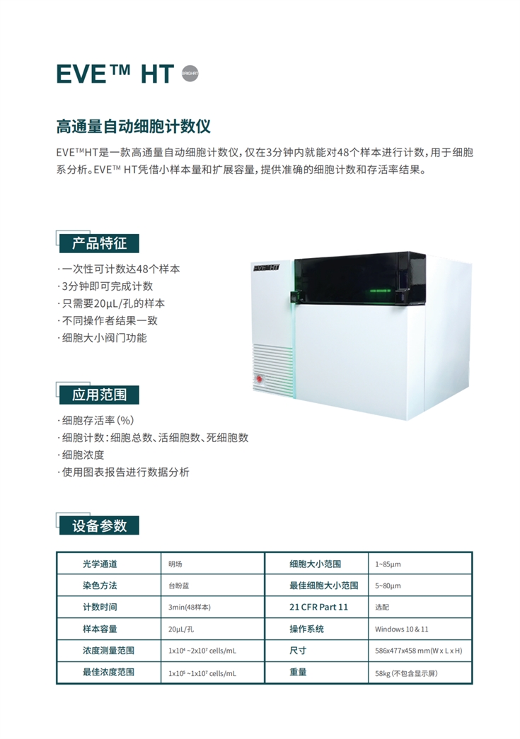 EVE?HT是一款高通量自動(dòng)細(xì)胞計(jì)數(shù)儀,僅在3分鐘內(nèi)就能對(duì)48個(gè)樣本進(jìn)行計(jì)數(shù),用于細(xì)胞系分析。EVE? HT憑借小樣本量和擴(kuò)展容量,提供準(zhǔn)確的細(xì)胞計(jì)數(shù)和存活率結(jié)果。